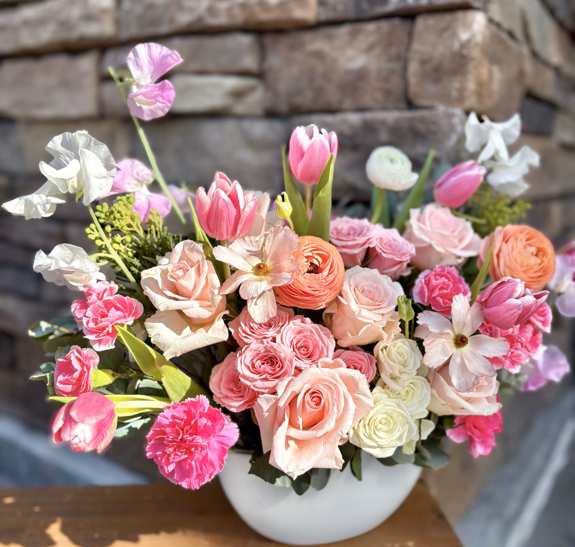 “Saishun” brings together the vivid palette of early spring—layered pinks, whites, corals, and fresh greens. A radiant arrangement that captures the joy of seasonal change, perfect for heartfelt gifts or brightening everyday moments.